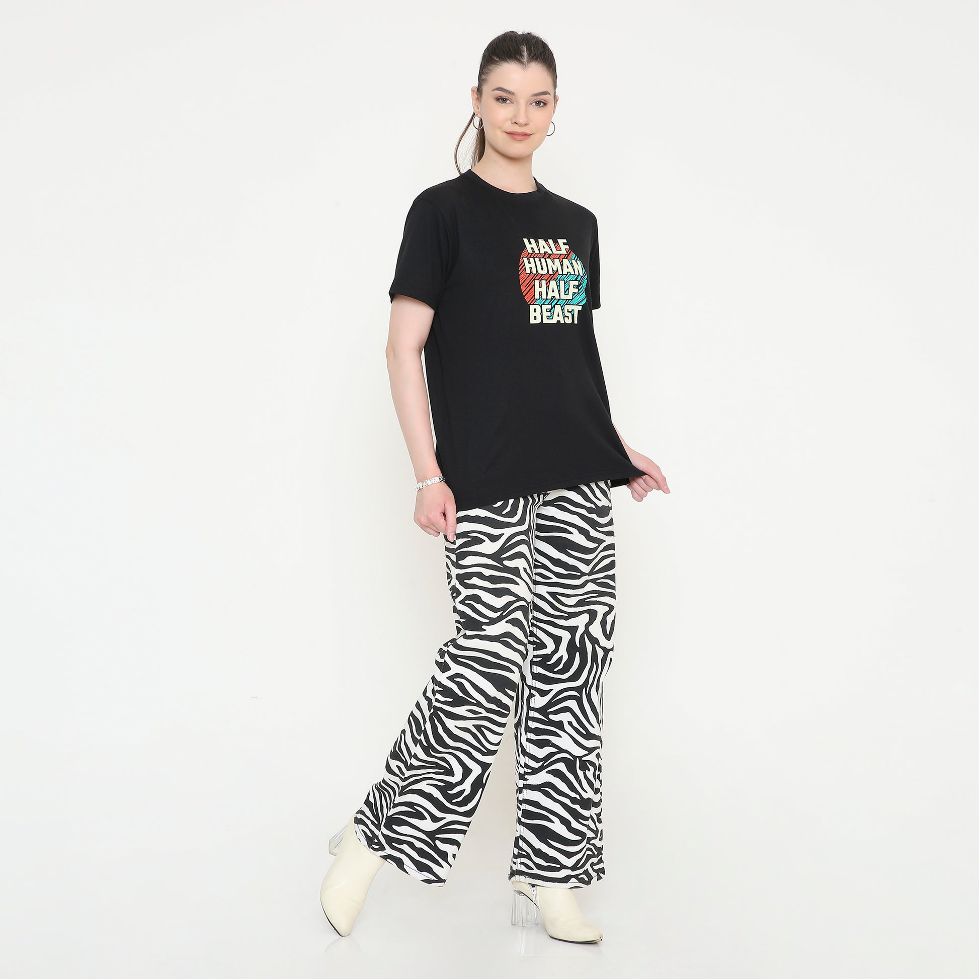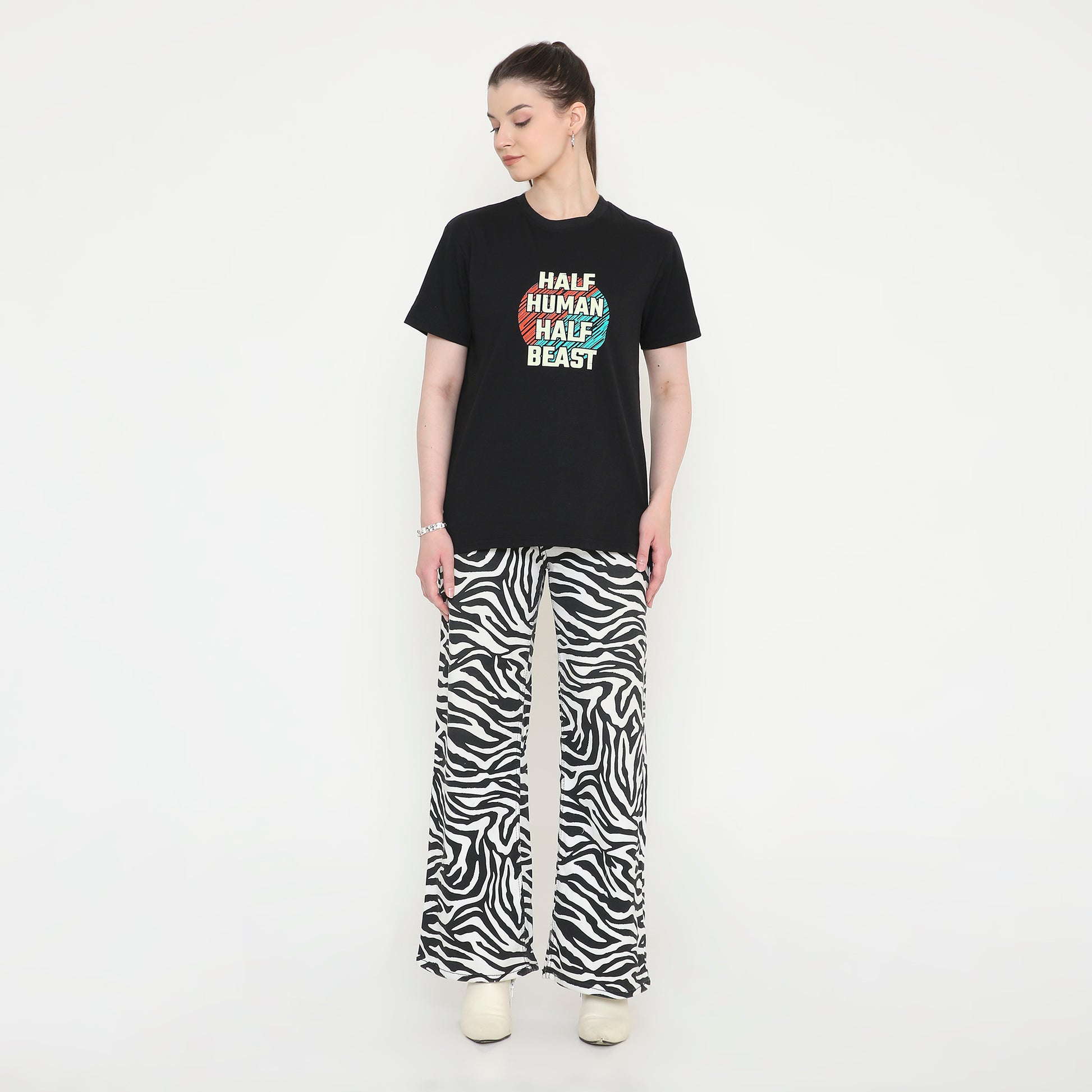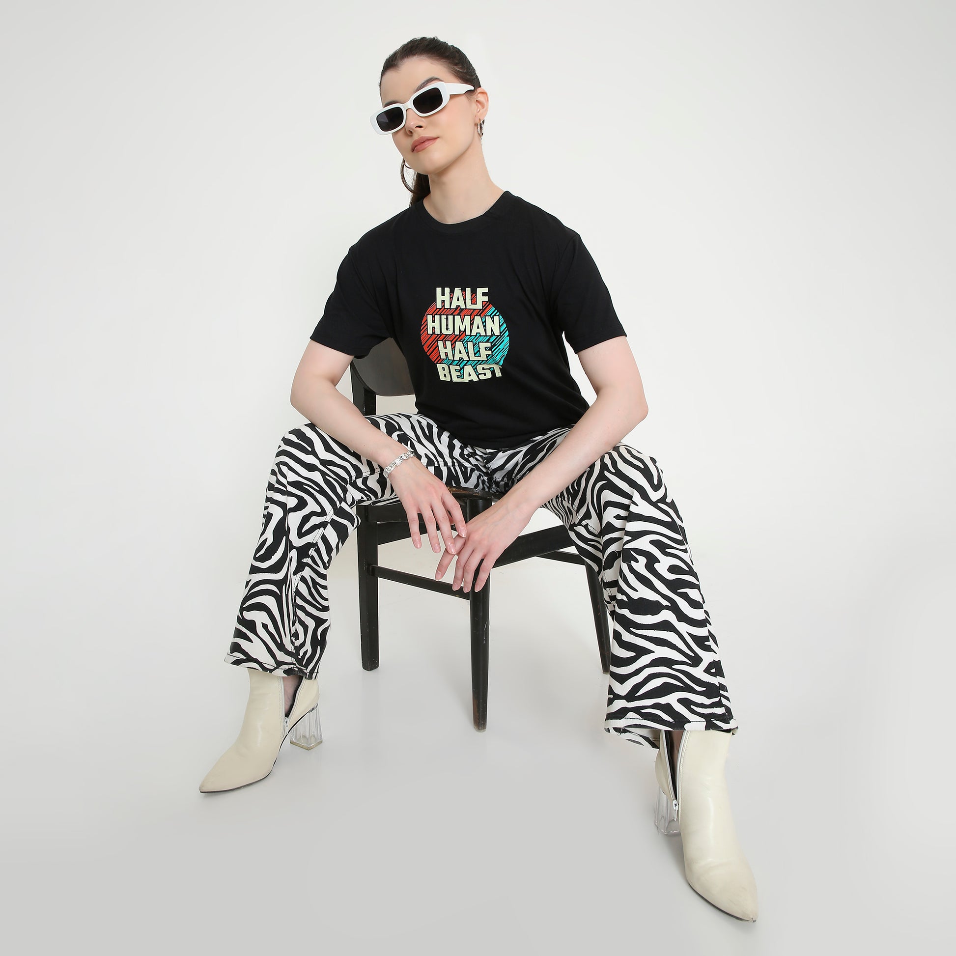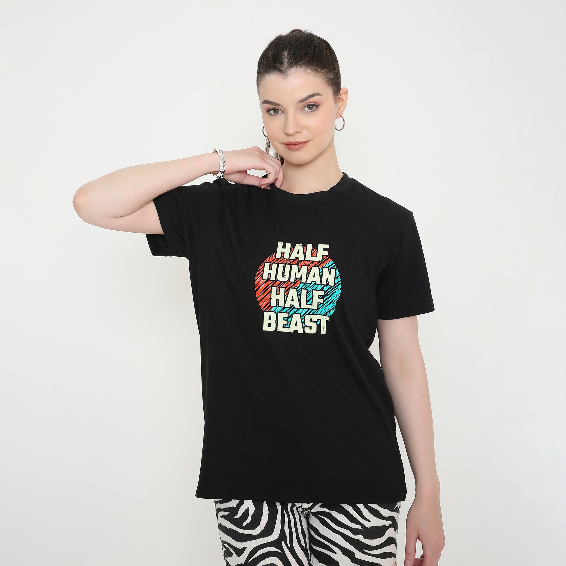 Unleash your dual vibe in this black oversized tee featuring a bold "Half Human Half Beast" graphic. Made from soft, breathable polycotton and designed for a relaxed fit, it's available in sizes XS to XL.