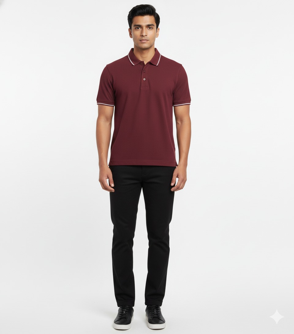 A rich maroon base accented with minimal white tipping for subtle character. Perfect for someone who wants a classic polo with a hint of style. Works well with black, cream or charcoal bottoms.