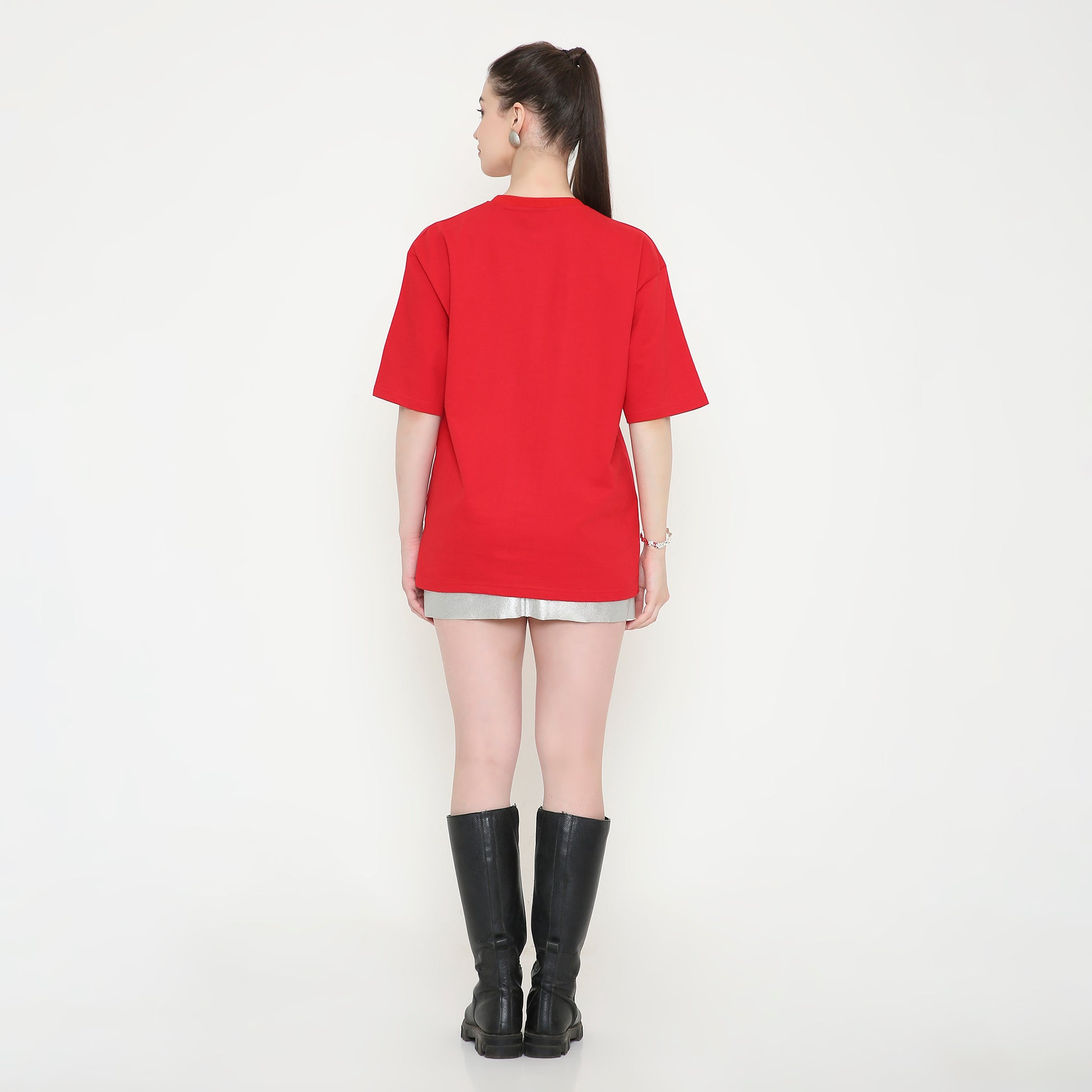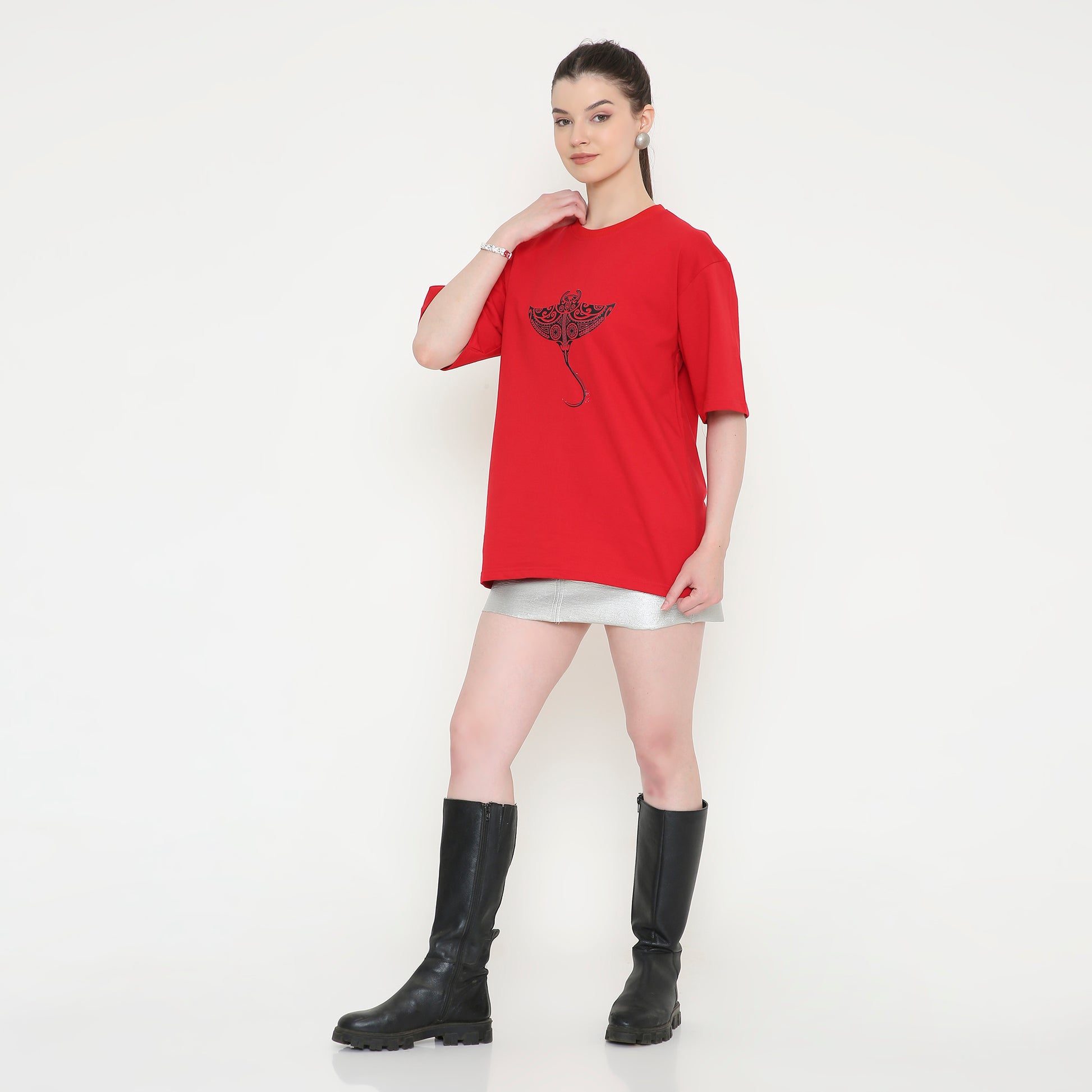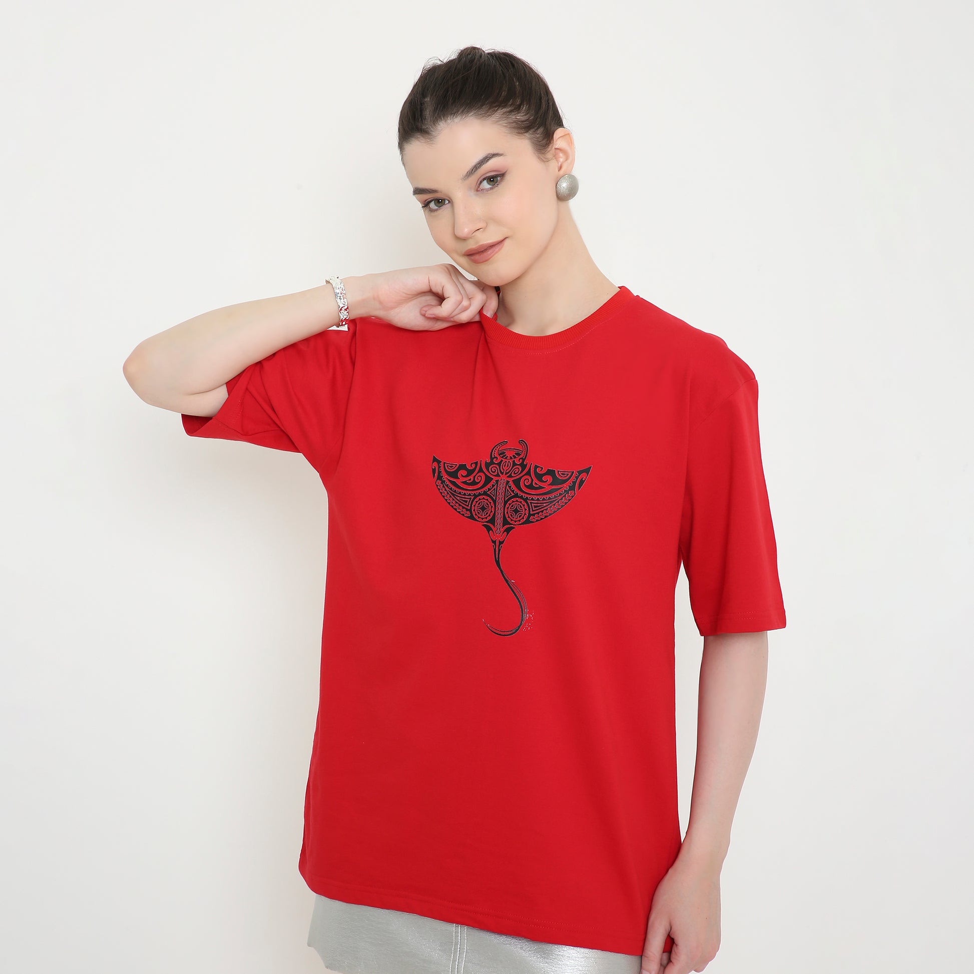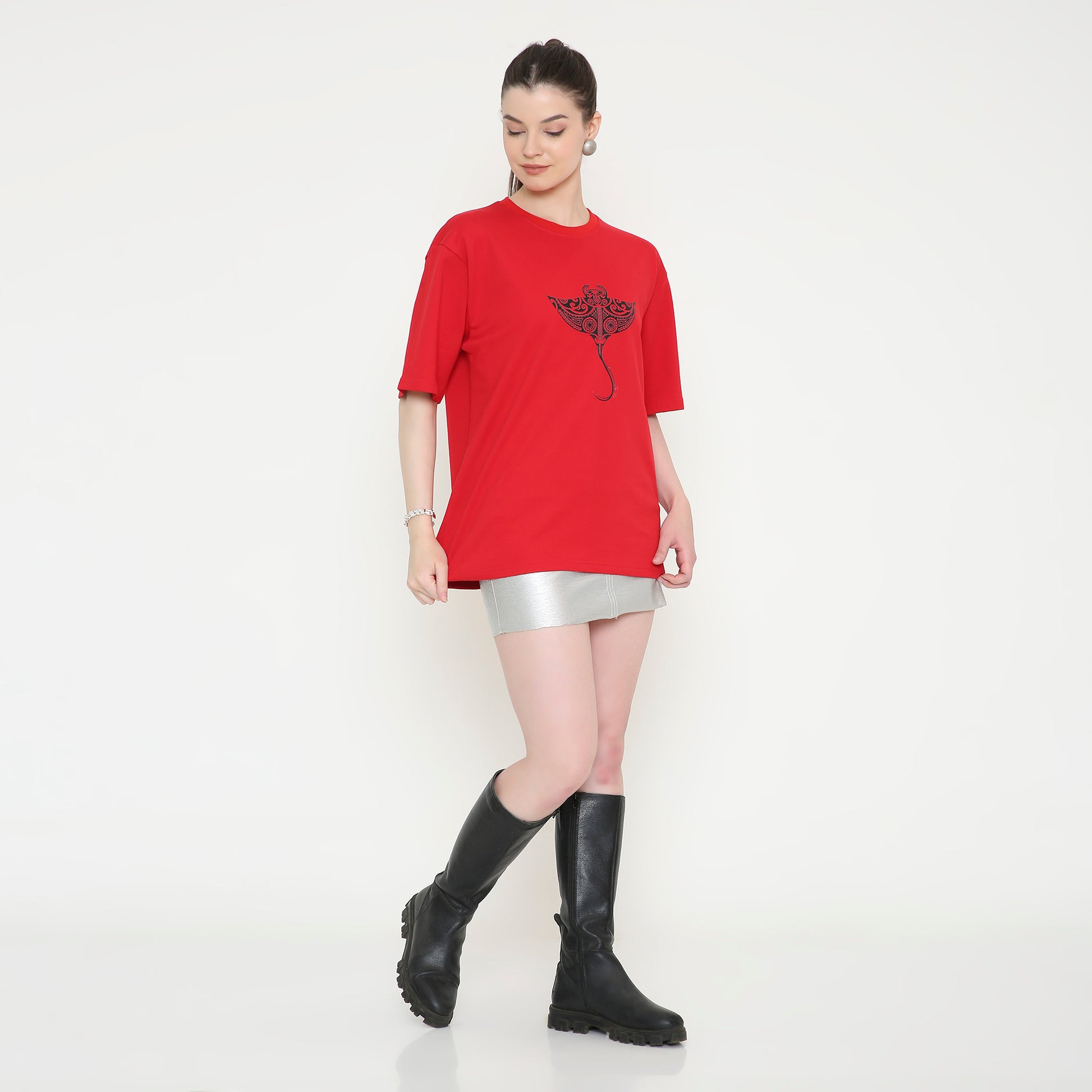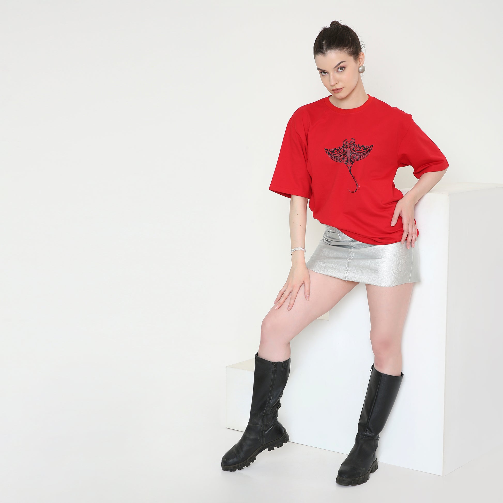 Add a pop of bold red to your wardrobe with this oversized tee featuring a striking mystical ray print. Crafted from soft polycotton for all-day ease. Available in sizes XS to XL.