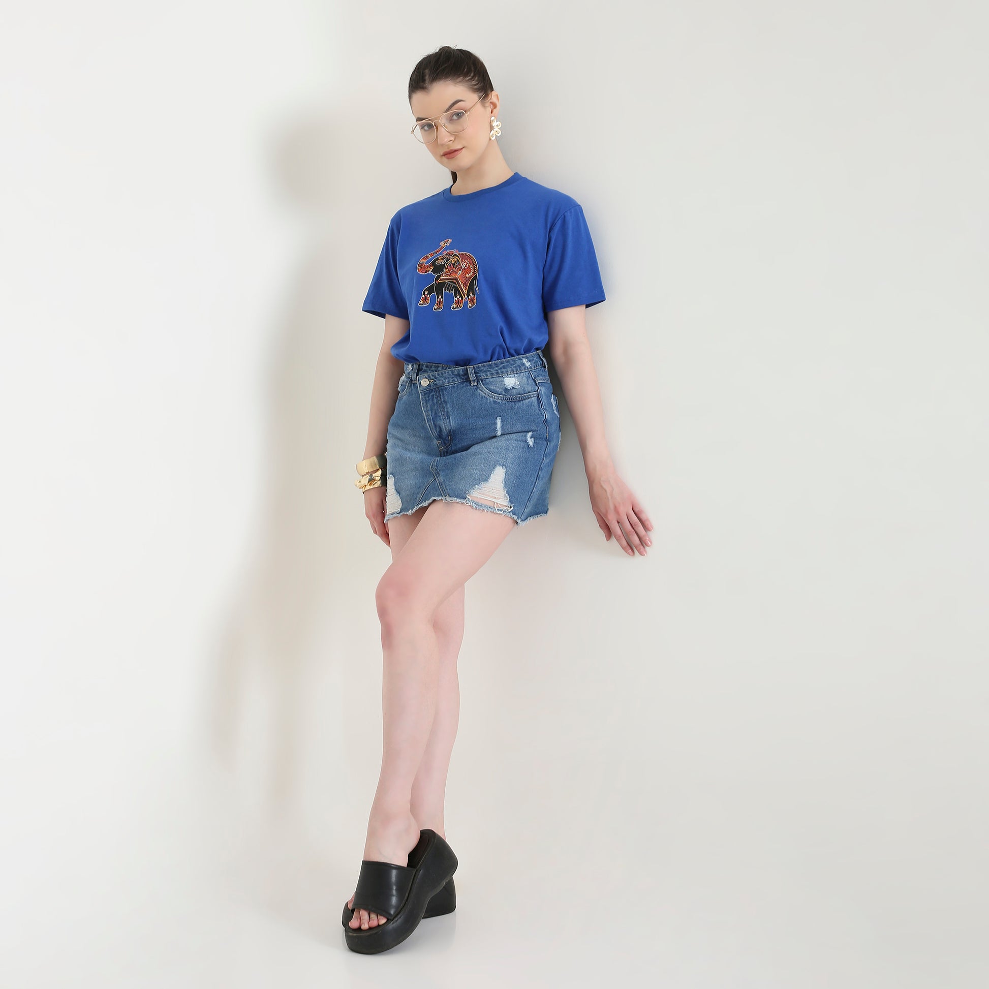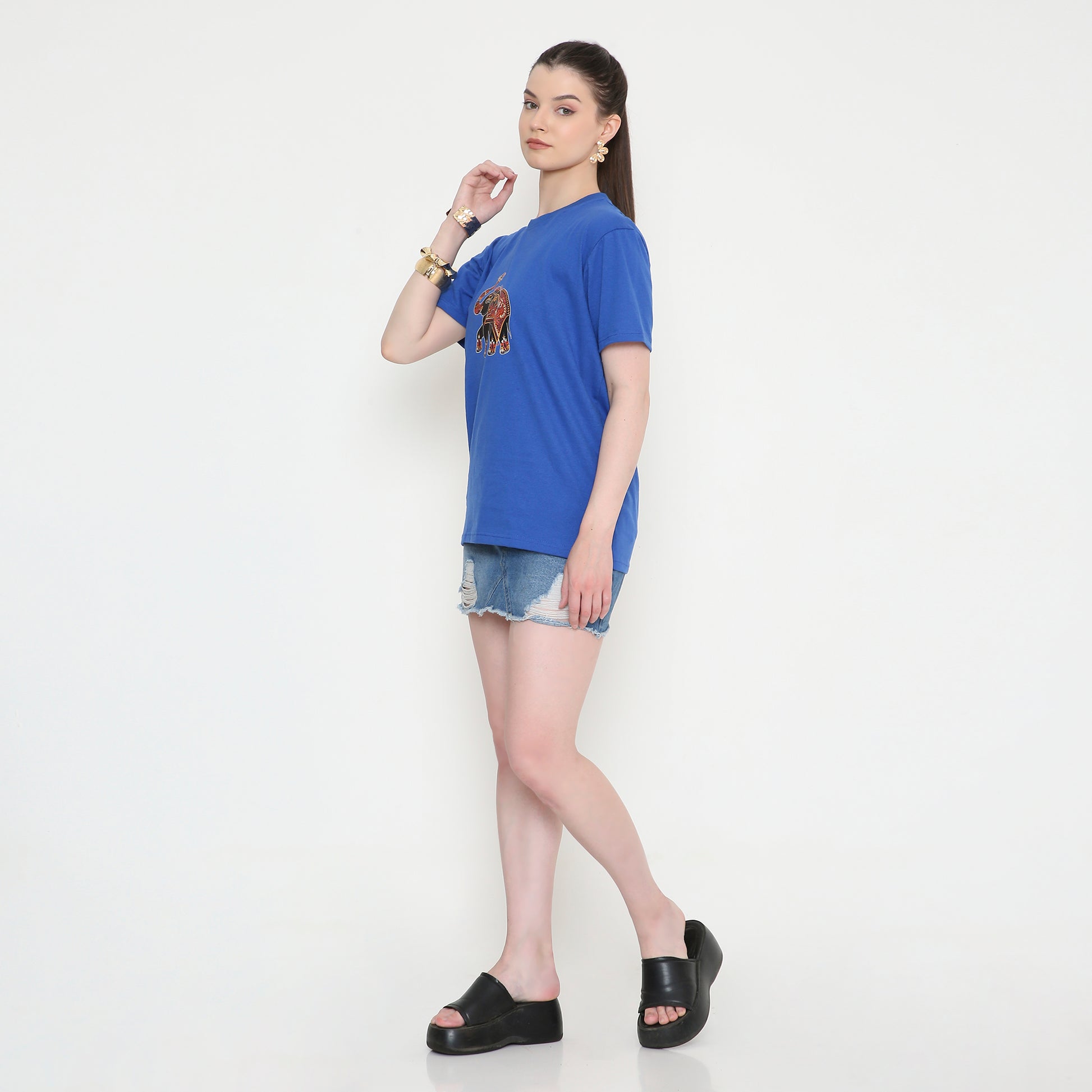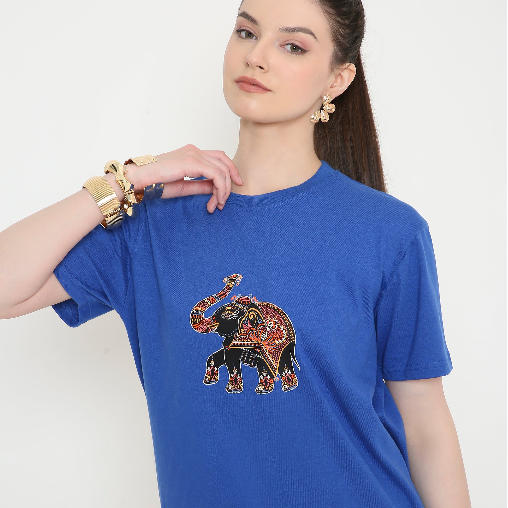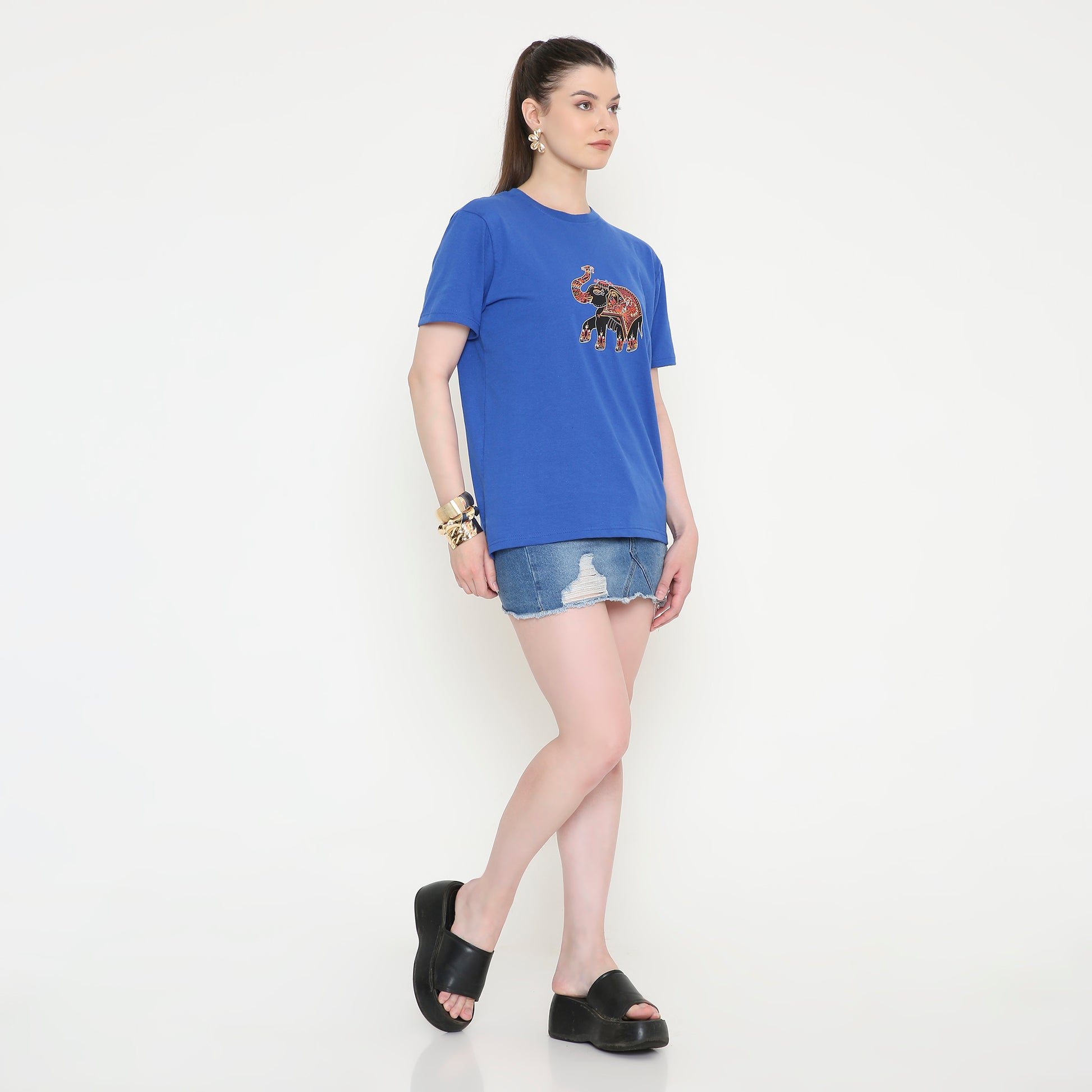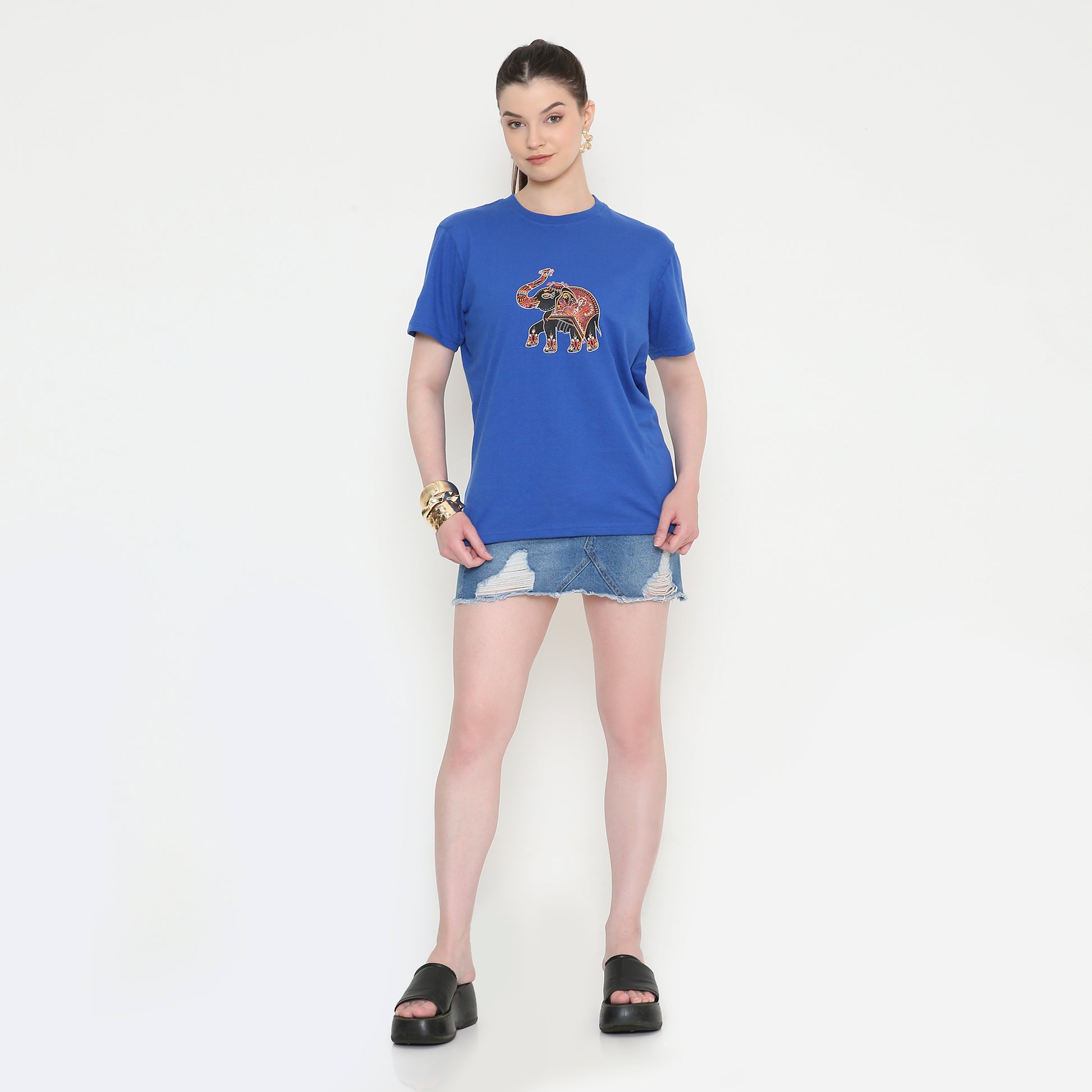 Add a pop of culture to your look with this blue oversized tee featuring an intricately printed elephant motif. Made from soft, breathable polycotton and tailored for a relaxed fit, it’s available in sizes XS to XL.